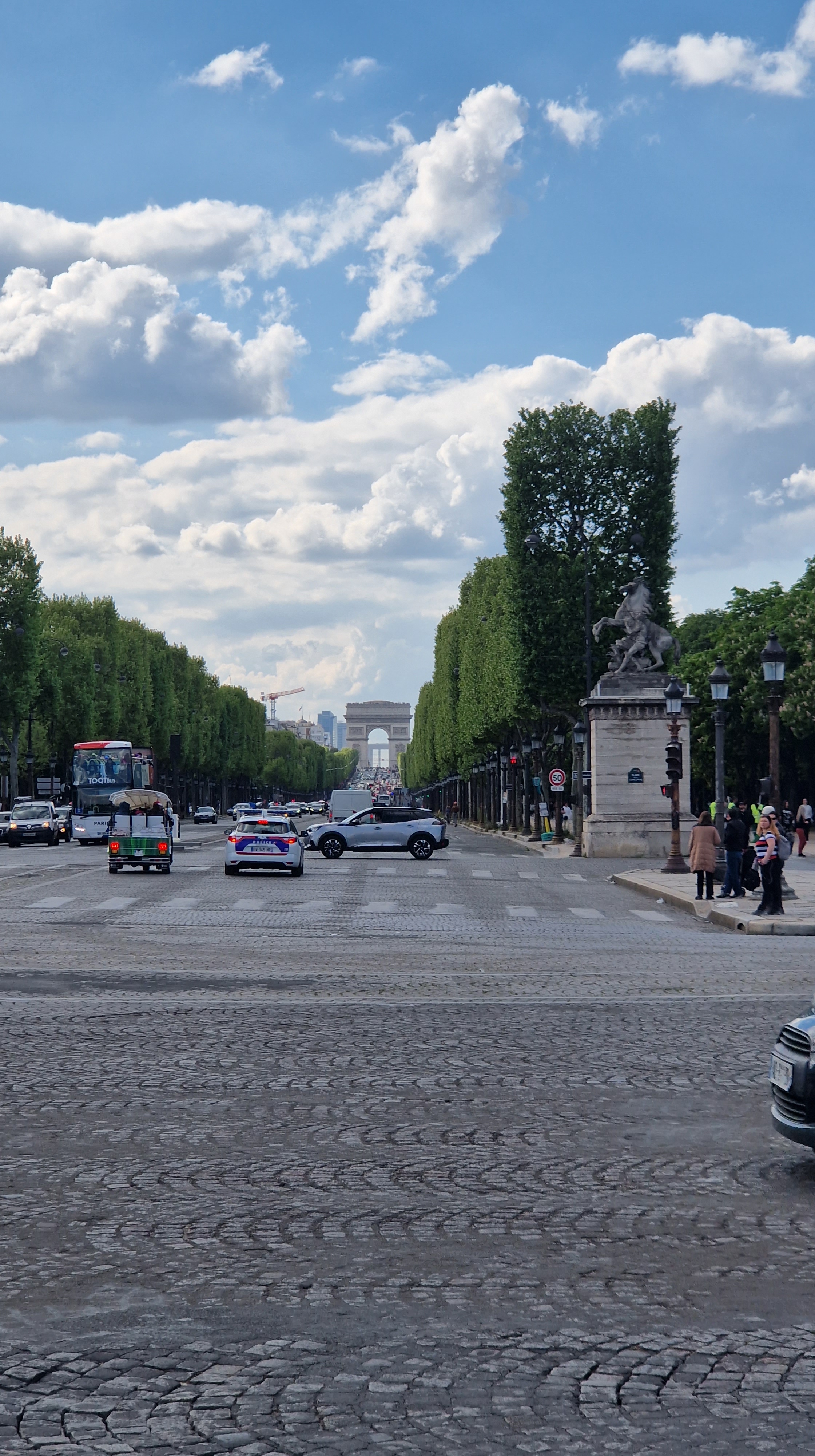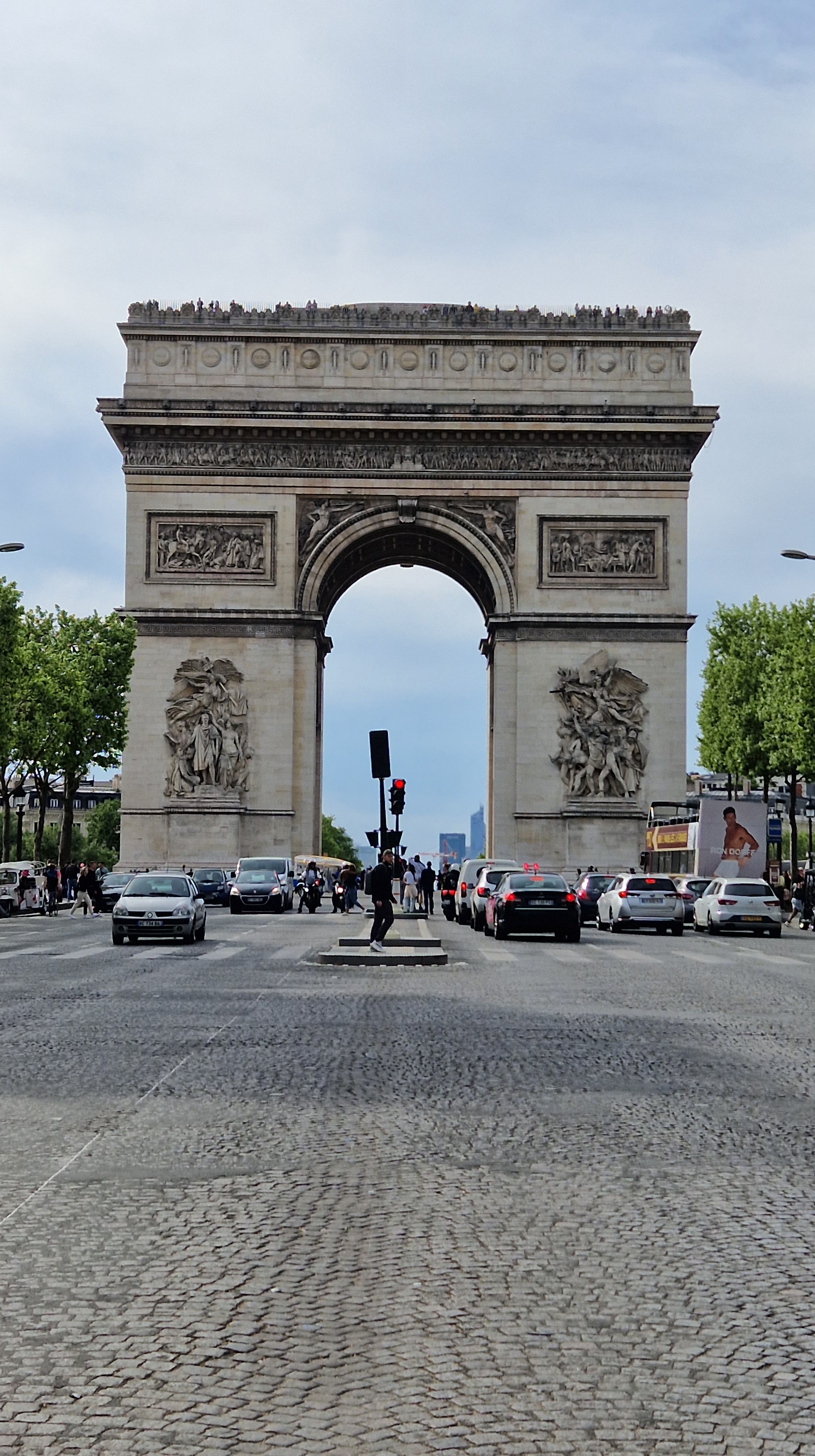 Once we descended the tower (we walked down the stairs from level two) we meandered past the Trocadero and up towards the Arc de Triumph. The rush hour traffic around it was insane! The queues to visit the arc were a mile long so we appreciated it from a distance before walking the length of the Avenue des Champs-Elysees. Well, all tours of France end on the Champs-Elysees.