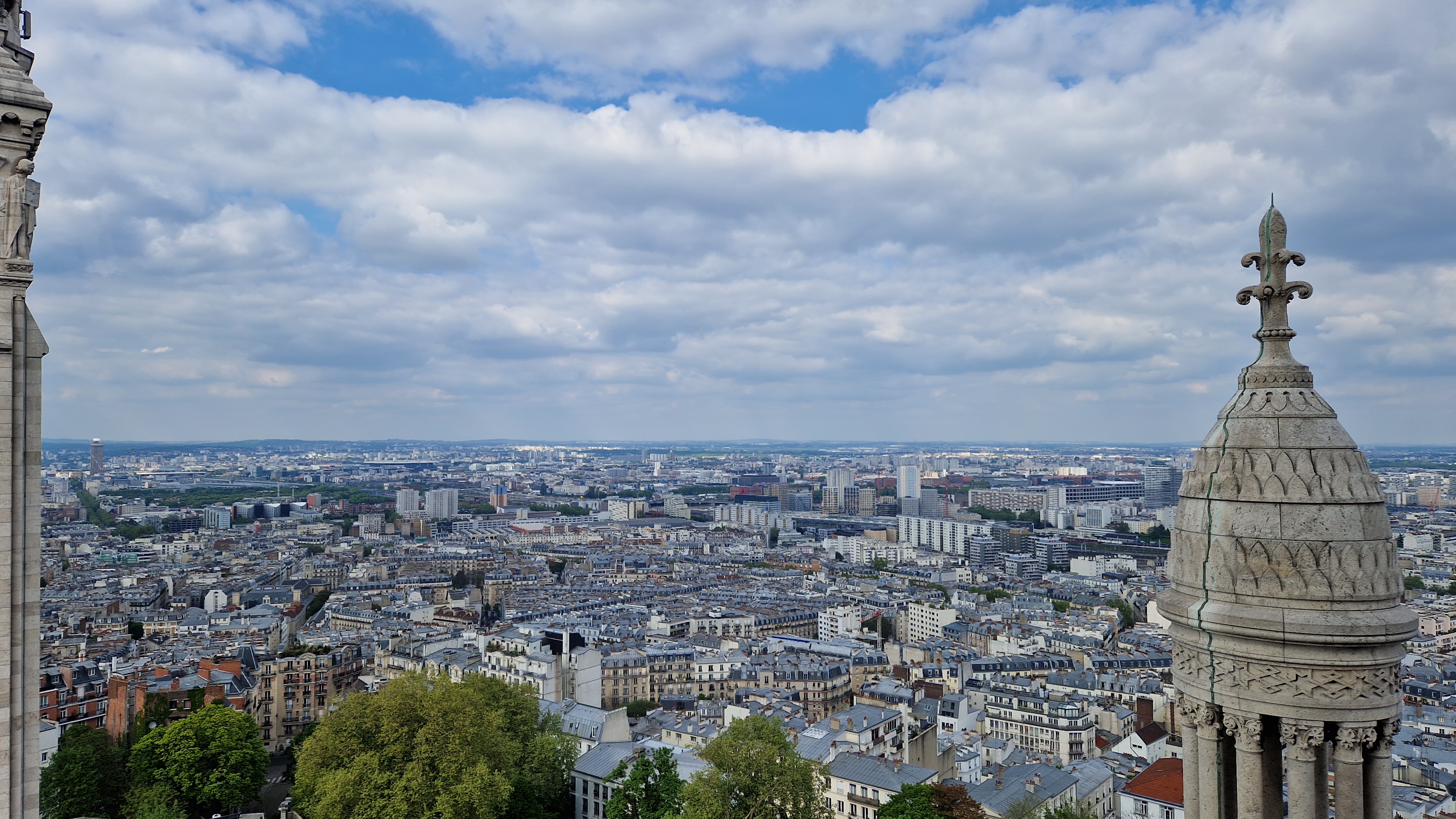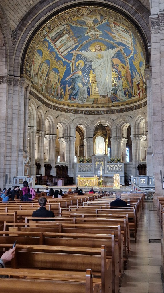 After a long walk through the twisting streets, we found ourselves in the Montmartre district of the city. Our destination was the most visited monument in Paris – Sacre-Coeur. If only I’d realised that reaching it meant climbing as many stairs! I was in need of oxygen before I reached the wide staircase leading up to the church itself. The views of the city made it all worthwhile; the stained glass of Scare-Coeur also made it worthwhile. We realised as we entered the building that you could also climb up to the dome for a mere 7 Euros each. That’s a climb that’s not for the fainthearted or the claustrophobic! 292 narrow, steep, spiral stone stairs take you up to the dome. I don’t often experience feelings of claustrophobia but by the last fifty steps I thought I was going to die! The walls were closing in on me (no idea if it does actually get narrower but it felt tighter), my heart was pounding out of my chest, I felt clammy, and my legs were like jelly. Thank God there was a stone bench to sit on at the top.