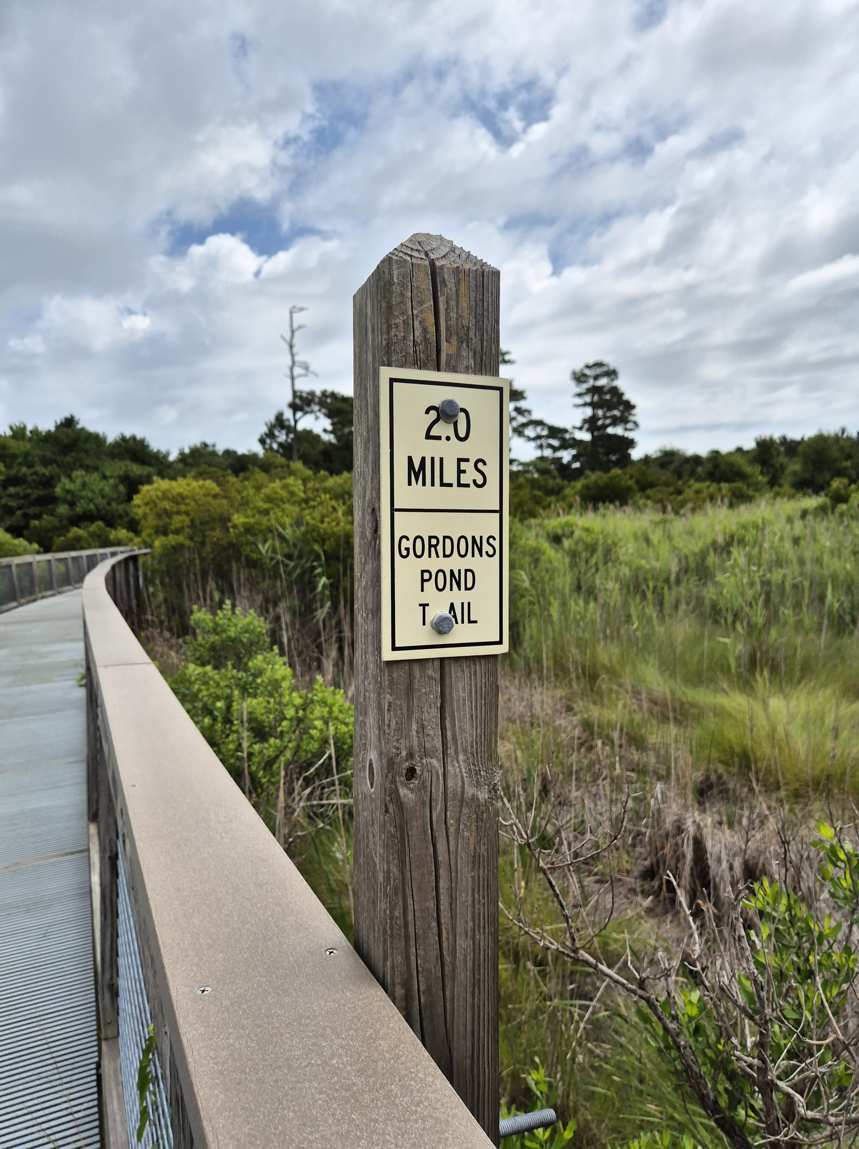 The Gordon’s Pond trail itself is 3.5 miles long. I had thought that it was a lap around the pond itself. It’s not. It runs along one side of the pond and is an out-and-back trail. It’s a lovely walk with lots of dragonflies flitting about. (They are nigh on impossible to photograph) I saw a few wading birds in the pond but not as many as I’d expected to see. I overheard a man commenting that there’s usually flocks of them but that they haven’t arrived yet this year. Parts of the pond looked quite dried up too.