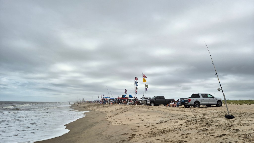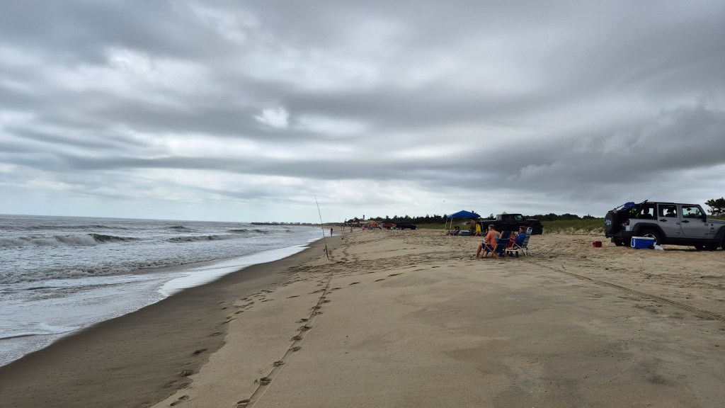 For those who don’t know, surf-fishing beaches are where the folk take their 4x4s and trucks right down onto the sand. They let out a lot of the air from their tyres to allow them to drive on the sand without sinking in. (There’s an airline at the end of the access road for pumping them back up when you leave) If you drive down onto the beach though you need to have a fishing line in the water. Folk then set up for the day with their chairs, their coolers, their flags flying high, music playing, kids and dogs playing…you can picture the scene, right?