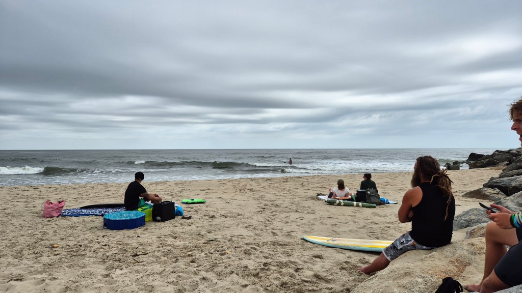 The trucks thinned out and I reached Herring Point, a surf beach. The surf crowd were all out too. Most of them were sitting about chatting, listening to music with their boards beside them as there weren’t that many big waves around. I stopped for a rest for a few minutes then kept going.