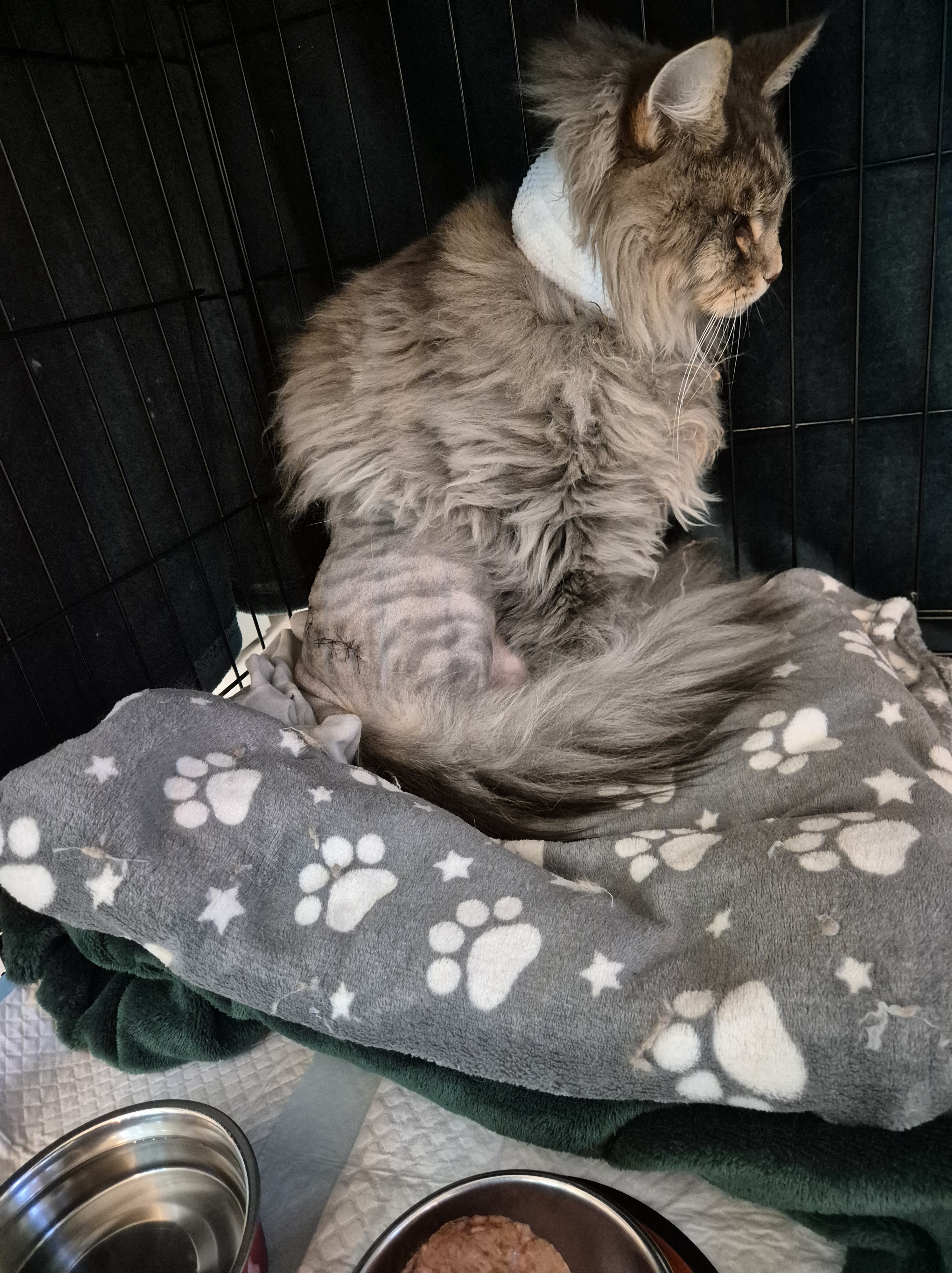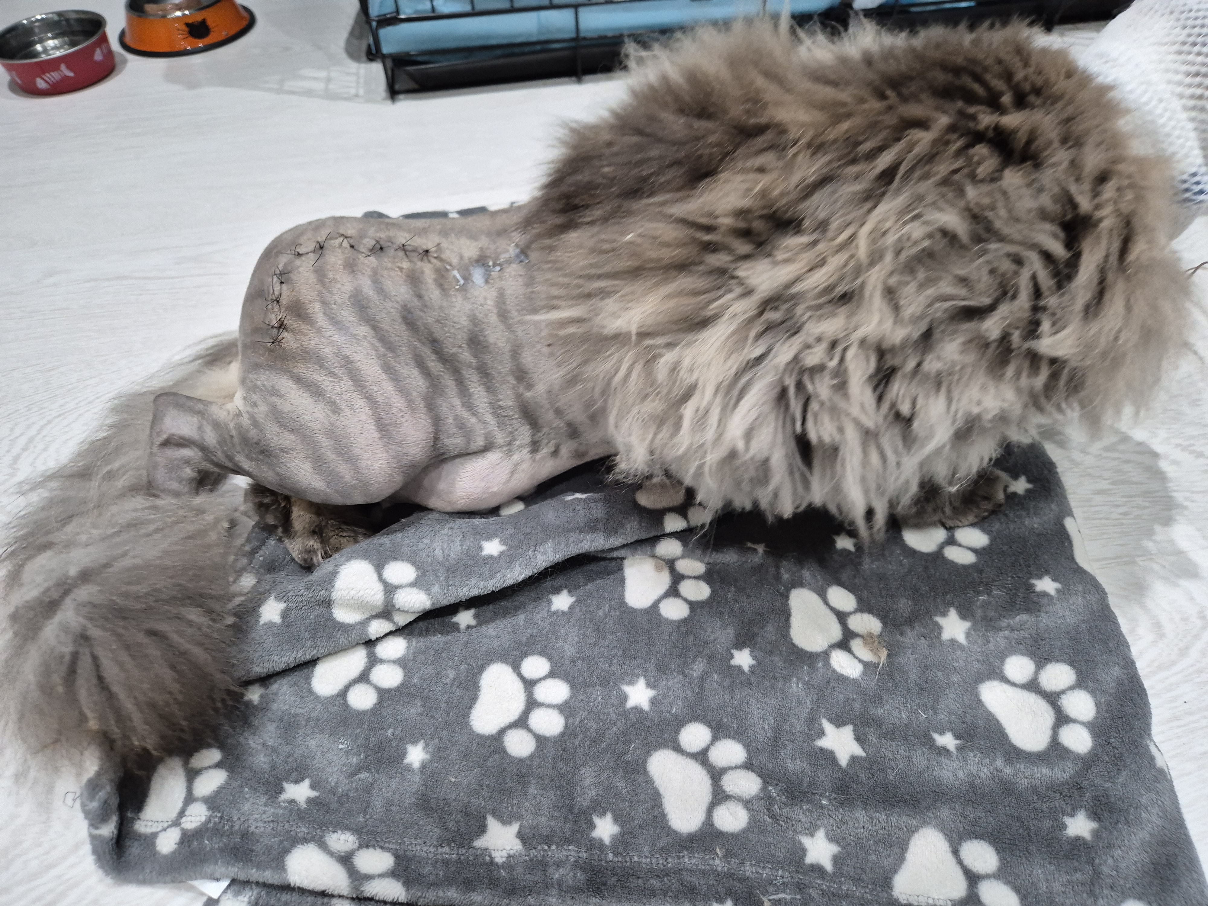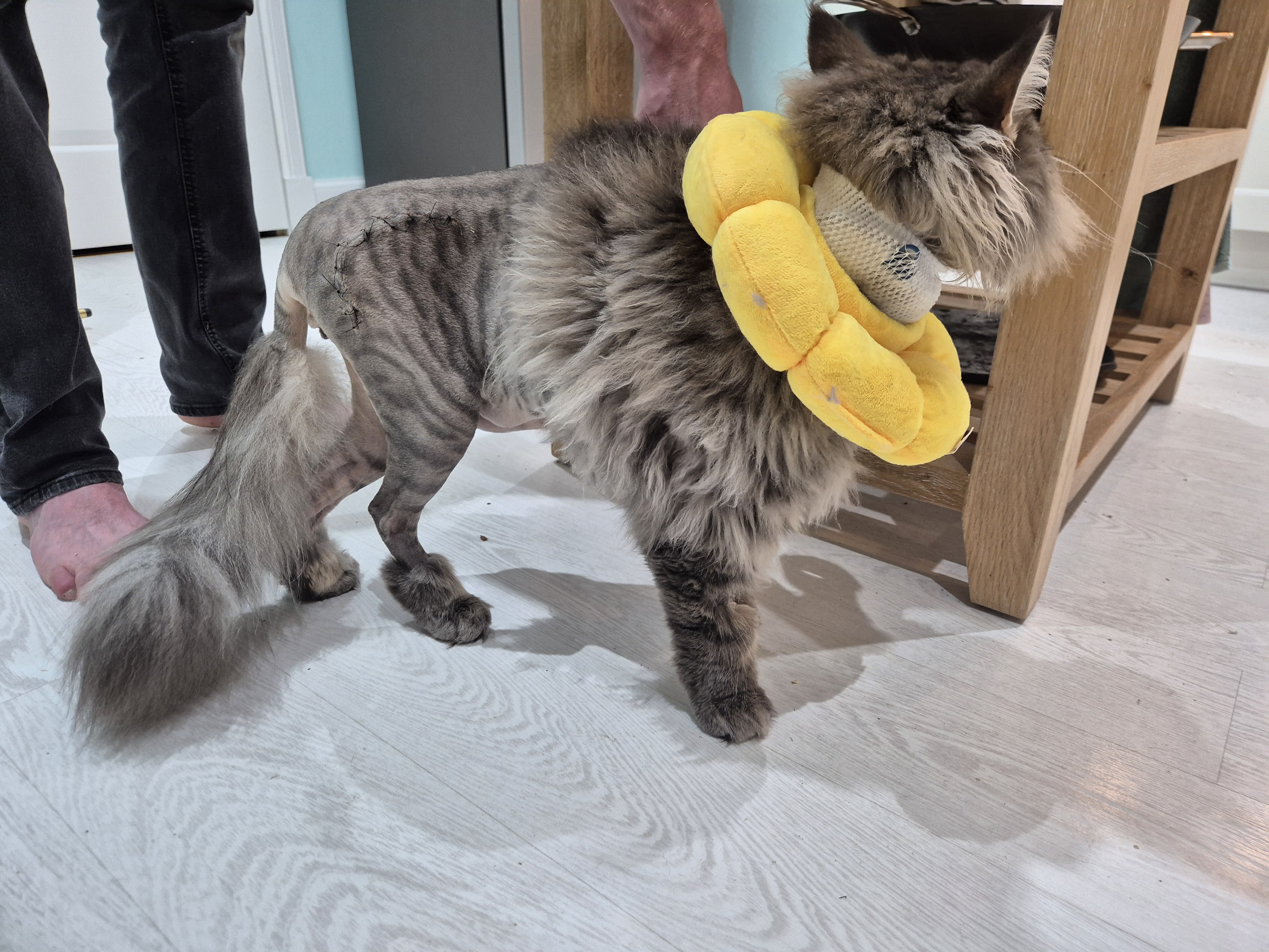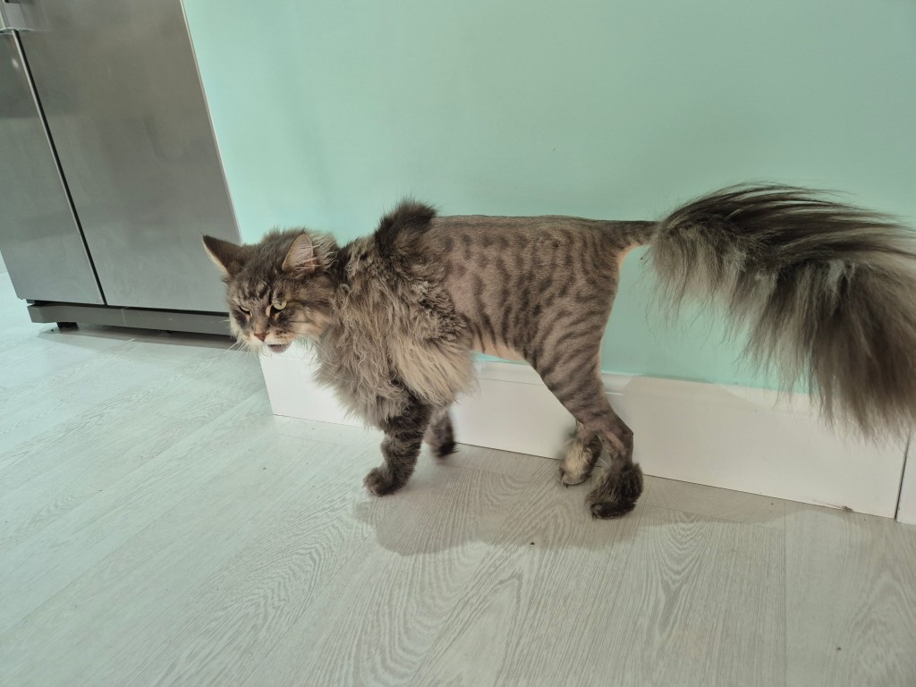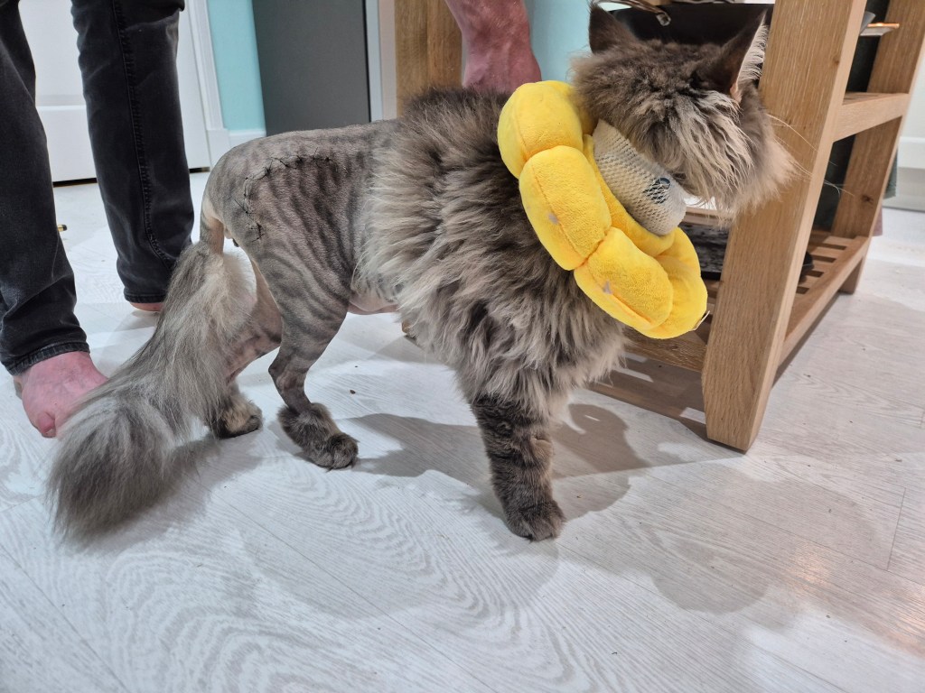 My boy is a warrior. He sailed through the surgery, thanks largely to skill of the veterinary team. The vet did apologise that they had had to shave quite a lot of his fur off and that once we got over the shock of seeing him, we would find his temporary look funny.