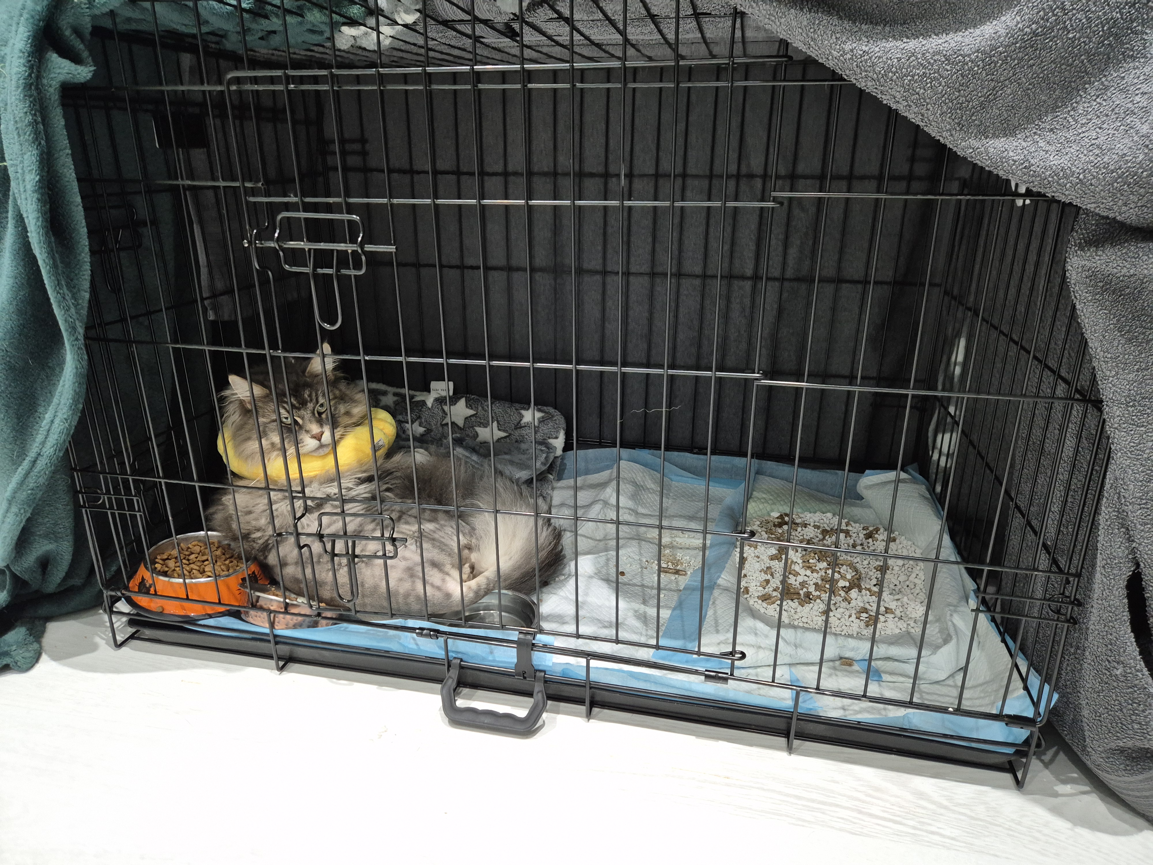 He was to be on cage rest for at least eight weeks, when we would go back for his follow up appointment. Initially he came home with a feeding tube too as he wasn’t eating. I was shown how to tube feed him and care for the tube. It was removed by our local vet a week later- the first big step on his recovery journey.