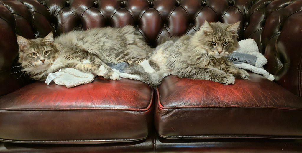 They are both young. Ragnar is just over two and his brother is eighteen months, so they’ll adjust to indoor living in time, I’m sure. The other local cats and wildlife will be breathing a sigh of relief.