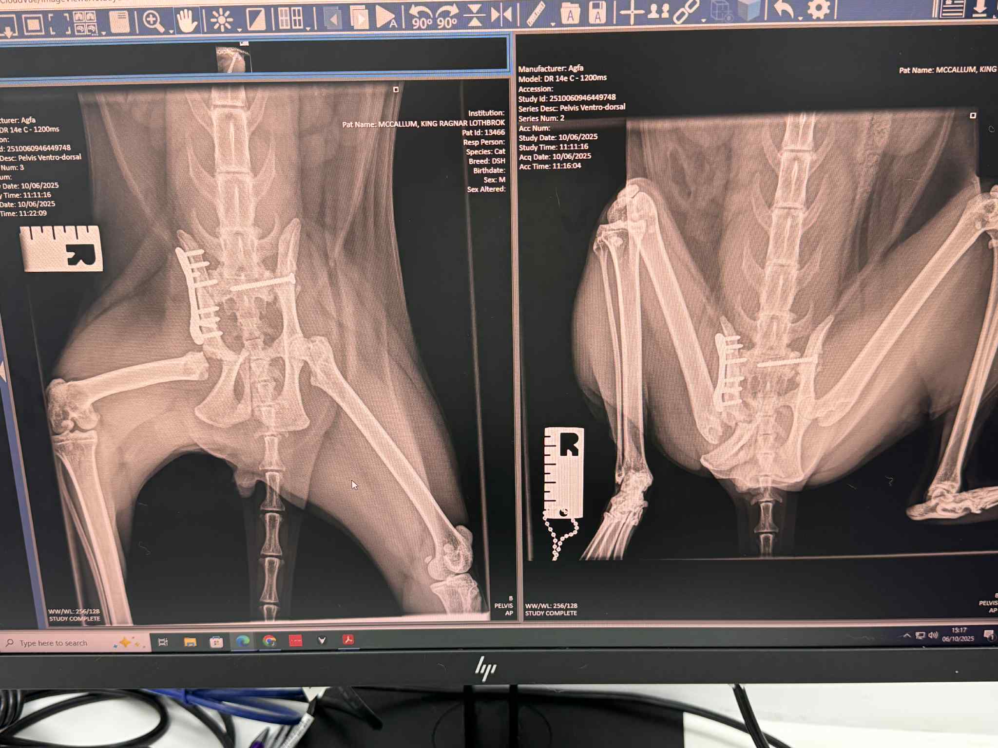 Monday was a long day. I spoke to vet who was going to operate first thing on Monday, and she explained the surgical plan for the day. She planned to put a screw in one side to pin the pelvis at that side to Ragnar’s sacrum. At the other side where the damage was worse, she proposed to plate and pin the top part of his pelvis but as the socket for his hip joint had been destroyed, she would also need to remove the  head of his femur to allow the leg to sit in the correct position and give him the best chance of good use of it. The vet estimated that it would take her five hours in theatre.