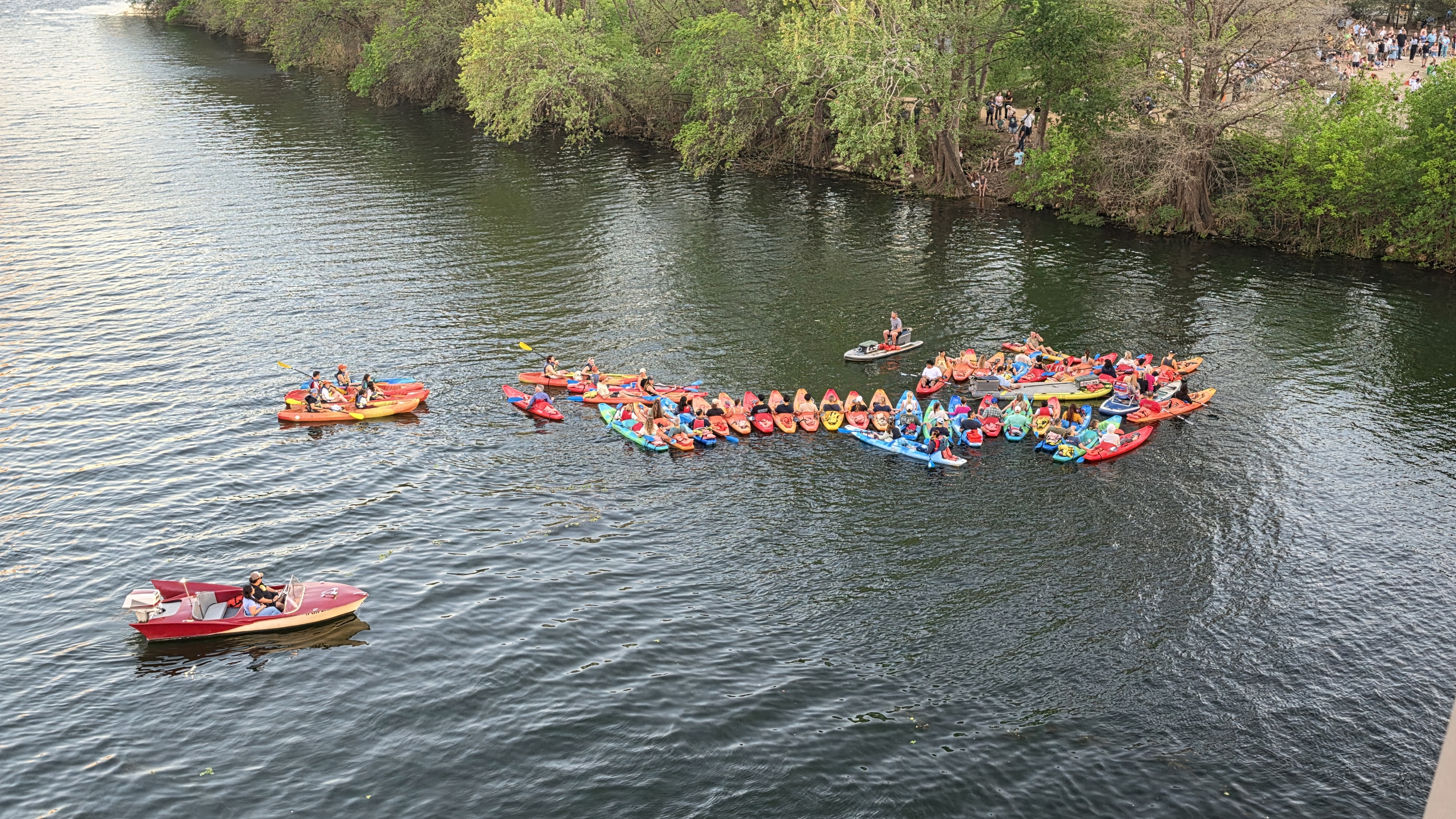 Every night at dusk the entire colony flies out from under the bridge. Folks wait on the bridge and down on the banks of Lady Bird Lake or in boats on the lake for hours waiting for the bats to flock out.