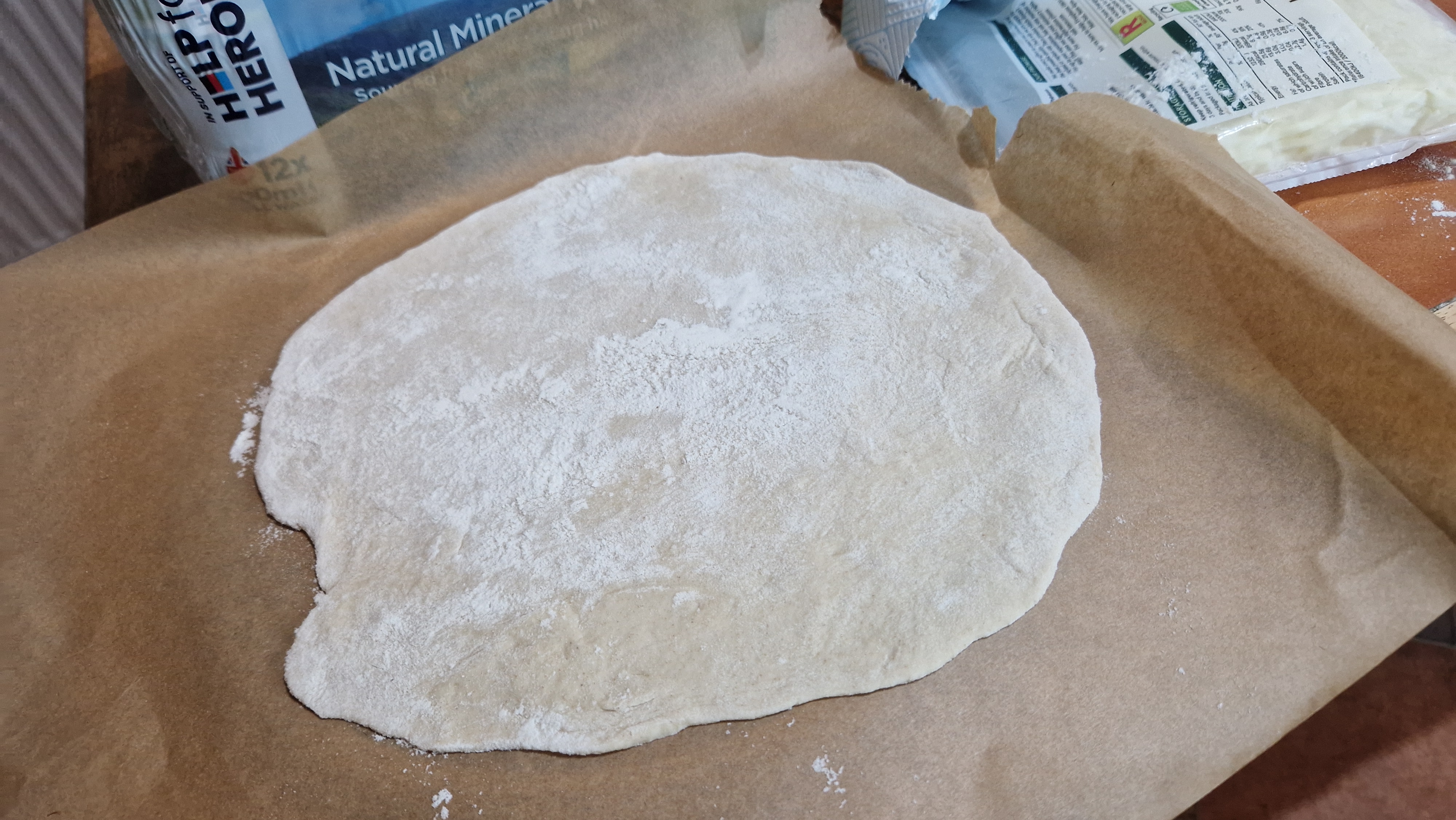 I rolled out three of the balls of dough…. I went for a more rustic look rather than round… OK I’m not very good with a rolling pin! They looked like pizza bases. Give me a break! LOL