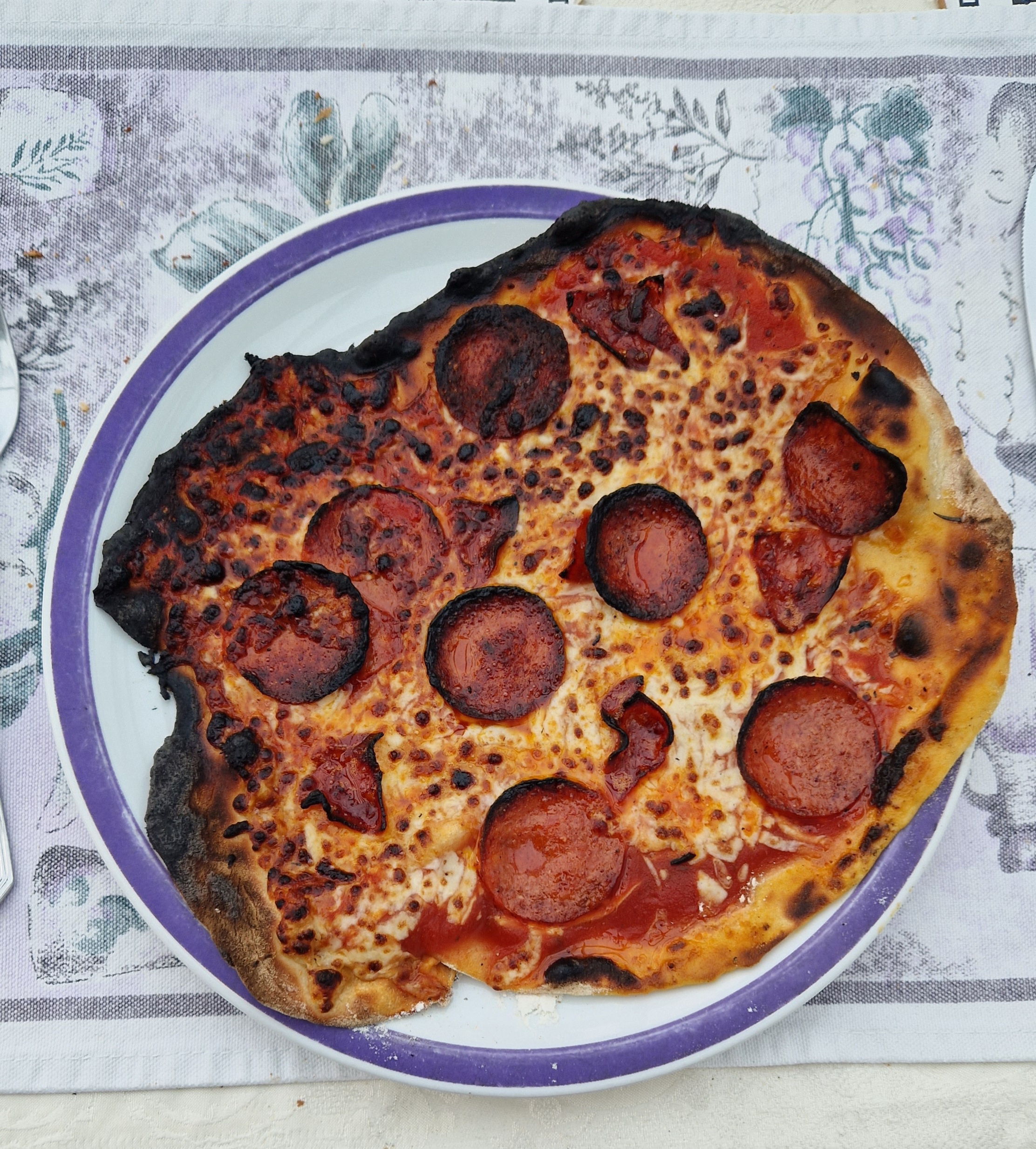 Adding the toppings was easy. Due to a lack of flour on the under side of the bases and inexperience, getting them onto the pizza peel, into the oven, off the peel, turned, back on the peel and onto the plate was slightly less successful….and exceedingly stressful!